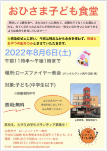 第2回おひさま子ども食堂のご案内☆ 2022 12/09 お知らせ 2022年7月21日2022年12月9日 8月のおひさま子ども食堂のご案内です🌞 コロナウィルス感染拡大に伴い、今回会食はせず、物資とおやつの配布のみとさせていただきます。 皆さんにお会いできるのを楽しみにしています(^^)/ お知らせ