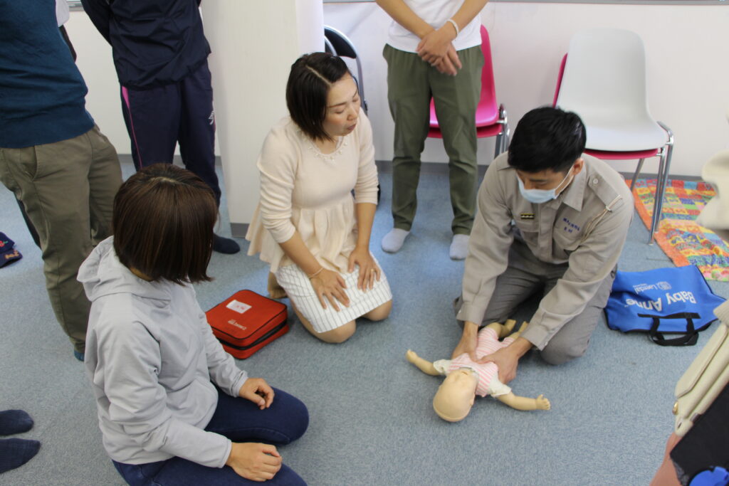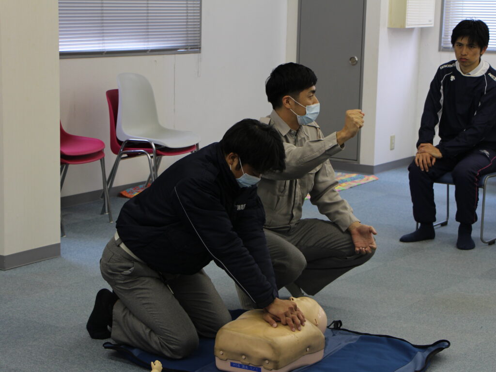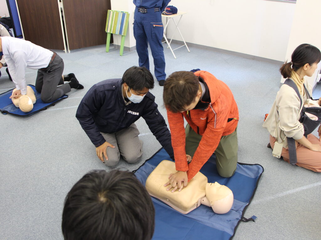 救急隊員が駆けつけるまで胸骨圧迫を止めてはいけないということを教わり、間を切らさないように交代で取り組みましたが、真剣にするととてもハードな運動でした💦💦