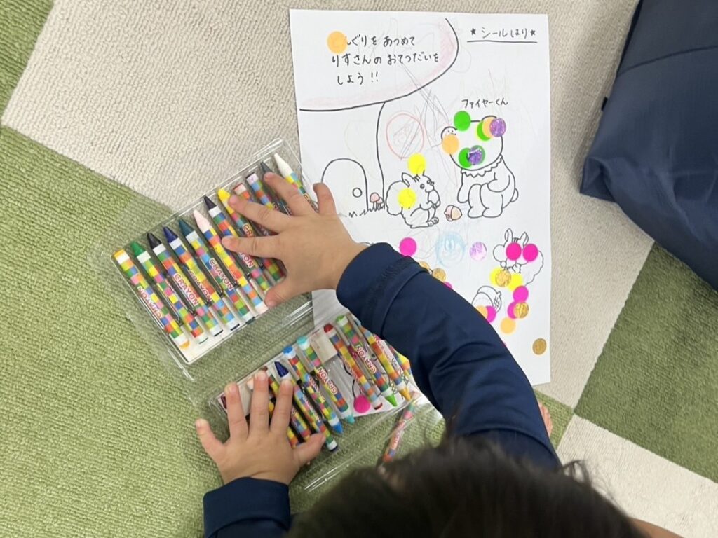 ぬりえやシール貼りは、スタッフのお姉さんが描いてくれたローズちゃんとファイヤーくんが登場します✨